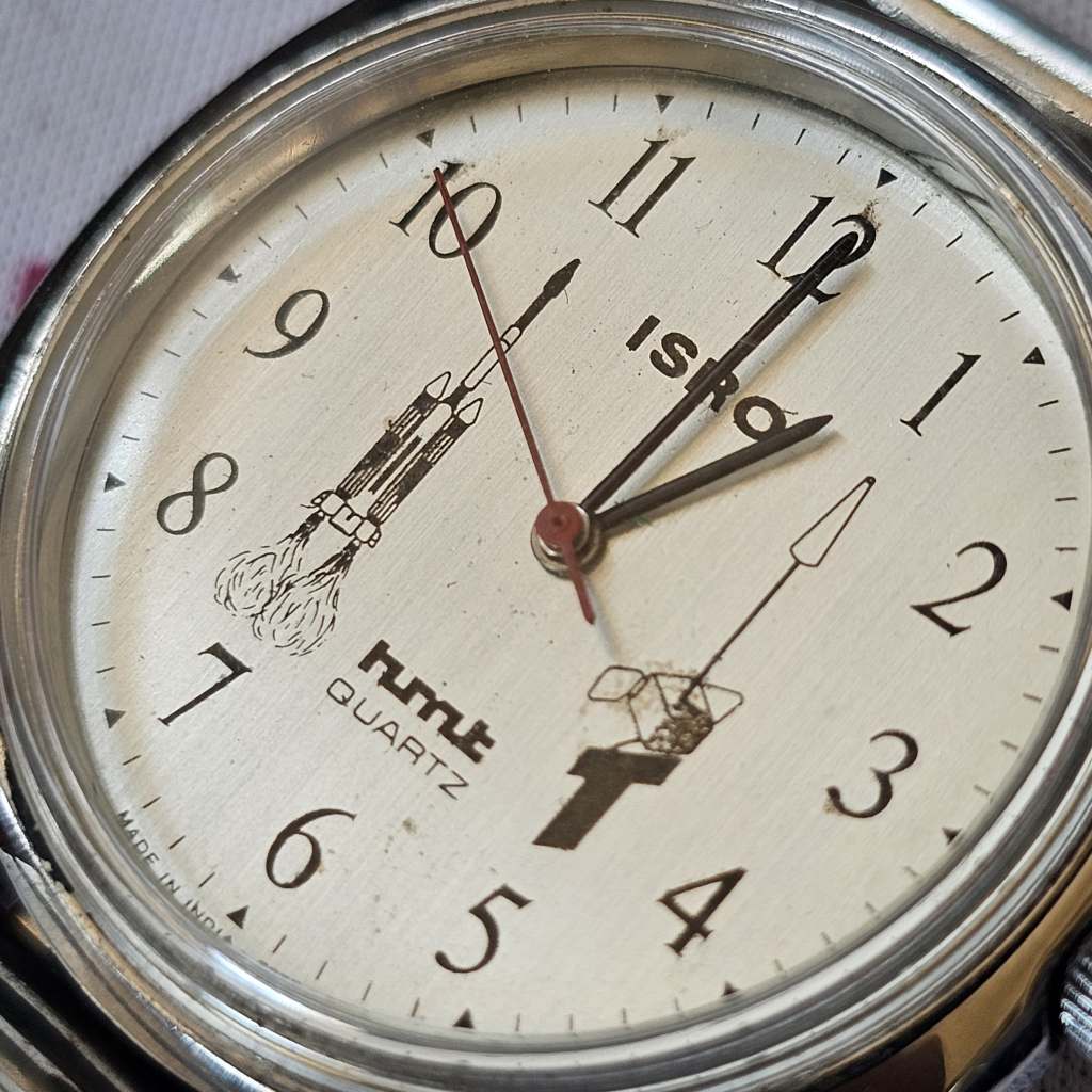 “This HMT watch was presented to all ISRO employees in 1987 after the successful launch of the Augmented Satellite Launch Vehicle (ASLV) in its third attempt. On one side is a small figure of ASLV rocket and on the other side the SROSS (Stretched Rohini Satellite Series) satellite figure. Full stainless steel body and strap .The current ISRO emblem was not existing in those days. ISRO is written in bold letters on top” said Dr.Venkitakrishnan PV, a distinguished scientist and a retired director from ISRO HQ.